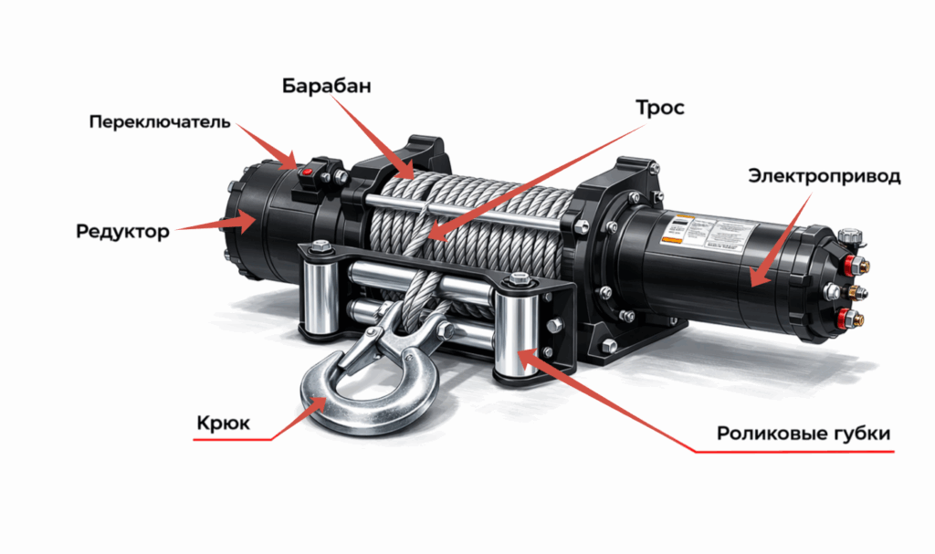 Редуктор понижает число оборотов и увеличивает тяговое усилие. Вращение с редуктора передаётся на барабан, который наматывает трос, создавая тяговое усилие и постепенно доставая застрявшую технику.