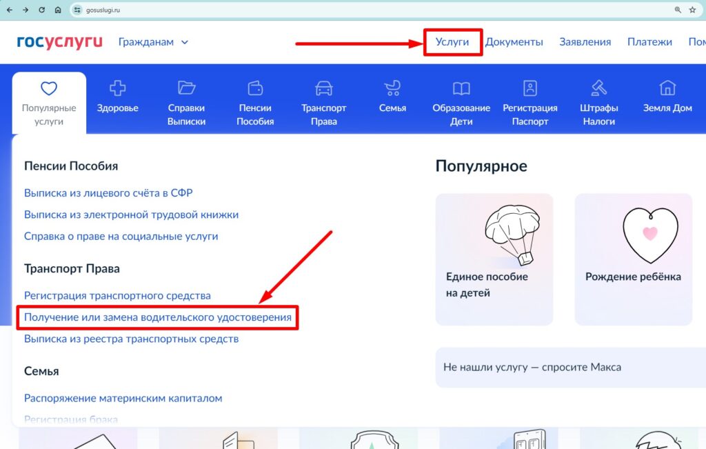 Заявление для получения прав также можно подать через Госуслуги: