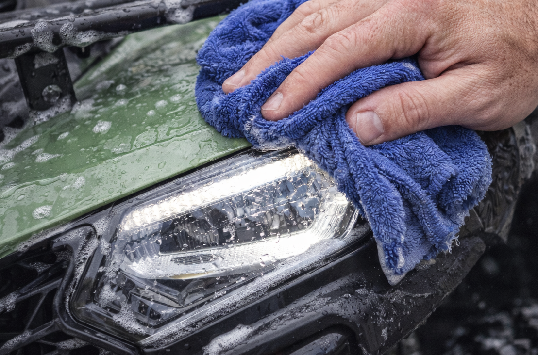 При ручной мойке можно воспользоваться мягкой губкой, а специальные щетки помогут удалить грязь из труднодоступных мест. После финального ополаскивания надо насухо протереть квадроцикл замшей, чтобы не оставалось разводов.