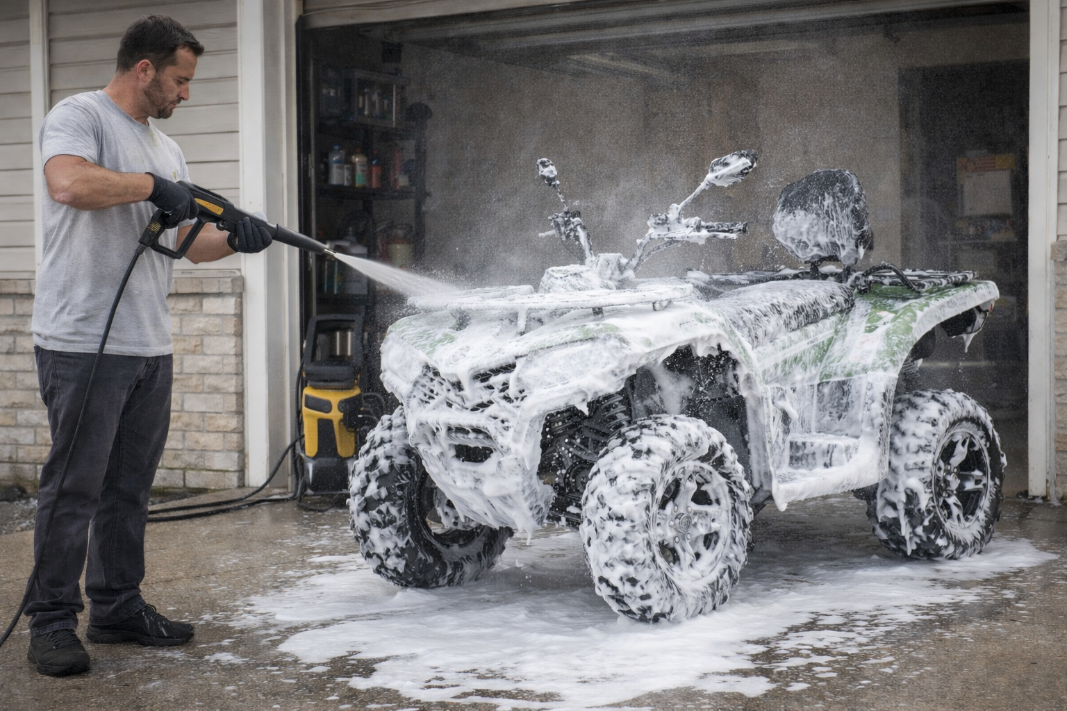 Мыть квадроцикл аппаратом высокого давления надо аккуратно. Нельзя, чтобы вода попала в воздушный фильтр. Также не рекомендуется направлять сильную струю на: